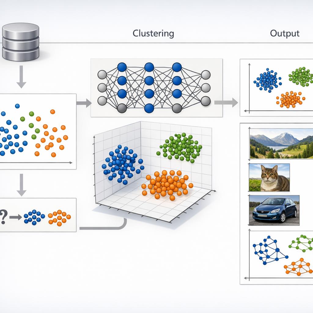 – Klasteriranje: dijeli podatke u grupe na temelju sličnosti. Primjeri: k-means (pretpostavlja kuglasti oblik klastera), hijerarhijsko klasteriranje (aglomerativno/dijelilno), DBSCAN (gustoćom temeljeno, otkriva proizvoljne oblike i izdvojke).