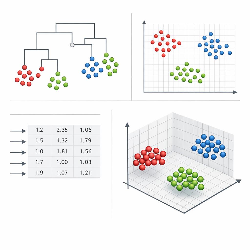 – K-means: dijeli podatke u k klastera minimizirajući varijansu unutar klastera; zahtijeva unaprijed zadani broj klastera i osjetljiv je na početne vrijednosti. Složenost približno O(n·k·t·d) (n = broj primjera, k = broj klastera, t = broj iteracija, d = dimenzionalnost).