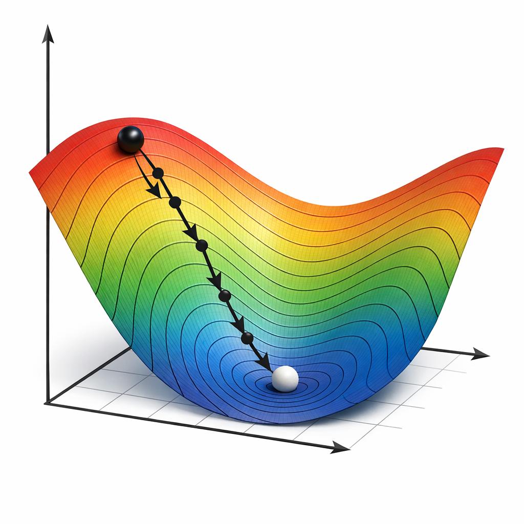 Gradientni spust (gradient descent) je osnovna numerička metoda za optimizaciju u strojnom učenju i statistici. Cilj je minimalizirati funkciju gubitka f(θ) promjenom parametara θ u smjeru negativnog gradijenta ∇f(θ), koji lokalno pokazuje smjer najvećeg rasta funkcije. Metoda je temelj za treniranje modela, uključujući linearne regresije, logističku regresiju i duboke neuronske mreže.