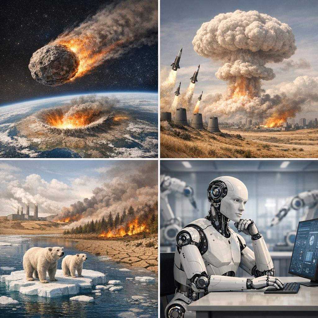 – Antropogeni: nuklearni rat s globalnim posljedicama, biotehnologija koja stvara izrazito zarazne patogene, neodgovorno razvijena opća umjetna inteligencija (AGI) koja djeluje protiv ljudskih interesa, dugotrajne neželjene posljedice klimatskih promjena u kombinaciji s društvenim kolapsom.